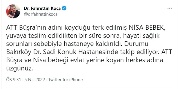 Son dakika haberine göre Acil Tıp Teknisyeni Büşra Durmaz, Pendik'te boş bir araziye terk edilmiş 3 aylık bebeğe süt annelik yapmasıyla gönülleri fethetti. Durmaz bebeğe 'Nisa Mihriban' ismini verdi. Sağlık durumunun kötüye gitmesi üzerine yoğun bakıma kaldırılan Nisa bebek hayatını kaybetti. Bebeğini sokakta terk ettiği gerekçesiyle gözaltına alınan Ebru S. tutuklama talebiyle hakimliğe sevk edildi. Nisa bebeğin ölümünde ihmal olabileceği şüphesiyle Çocuk Hizmetleri Genel Müdürlüğü'nde görevli bir bakıcı hakkında da işlem başlatıldı. Aile ve Sosyal Hizmetler Bakanlığı'ndan yapılan açıklamada, 'Adli ve idari soruşturma başlatılmıştır' denildi. Öte yandan biyolojik anne Ebru S.'nin Nisa bebeği bırakma anı ortaya çıktı. Nisa bebeğin biyolojik annesi Ebru S. çıkarıldığı mahkemede 'kasten öldürmeye teşebbüs' suçundan tutuklandı. Anne Ebru S. tutuklanarak cezaevine gönderildi.