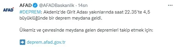 Afet ve Acil Durum Yönetimi Başkanlığının (AFAD) internet sitesinde yer alan bilgiye göre, saat 22.35'te Akdeniz'de, Muğla'nın Datça ilçesi açıklarında 4,5 büyüklüğünde deprem kaydedildi.