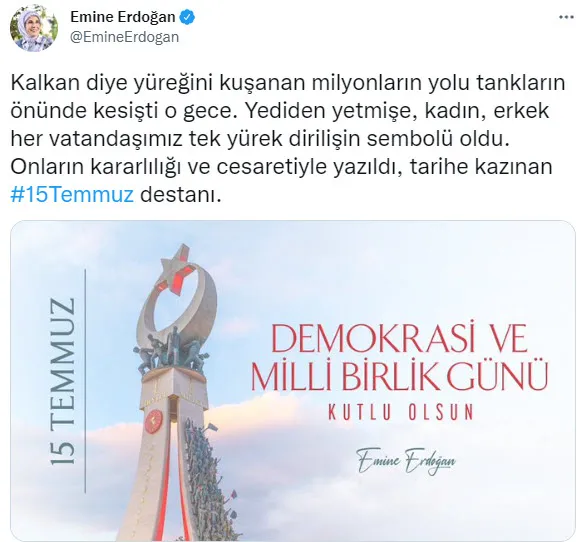 Başkan Recep Tayyip Erdoğan'ın eşi Emine Erdoğan, sosyal medya hesabından 15 Temmuz Demokrasi ve Milli Birlik Günü paylaşımında bulundu.