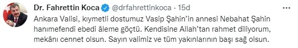 Twitter adresinden taziye mesajı paylaşan Bakan Koca, "Ankara Valisi, kıymetli dostumuz Vasip Şahin'in annesi Nebahat Şahin hanımefendi ebedi âleme göçtü. Kendisine Allah'tan rahmet diliyorum, mekânı cennet olsun. Sayın valimiz ve tüm yakınlarının başı sağ olsun." açıklamasını yaptı.