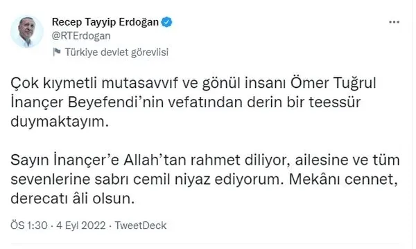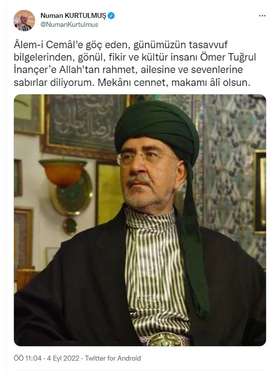Son dakika haberi... Türk düşünce hayatının en önemli isimlerinden yazar, hukukçu ve muttasavvıf Ömer Tuğrul İnançer 76 yaşında vefat etti. Hakk'a yürüyen Ömer Tuğrul İnançer'in cenazesi yarın Fatih Camii'nden kaldırılacak. Peki Ömer Tuğrul İnançer kimdir? Acı haber sonrası A Haber canlı yayınında anlattılar. Başkan Erdoğan, İnançer için sosyal medya adresinden başsağlığı mesajı yayınladı. Öte yandan İnançer'in ölüm haberini alan sevenleri, Pir Nurettin Cerrahi Tekkesi'ne geldi.