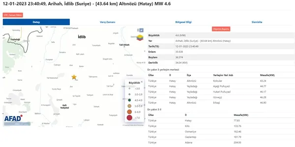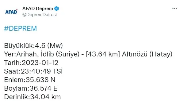 AFAD verilerine göre; Suriye’nin İdlib kentine bağlı Arihah kasabasında saat 23.40’ta 4.6 şiddetinde deprem meydana geldi. Deprem Hatay’da da hissedildi.