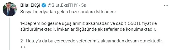 "Deprem bölgesine uçuşlarımız aksamadan ve sabit 550 lira fiyatla sürdürülmektedir. İmkanlar ölçüsünde ek seferler de konulmaktadır. Hatay'a da bu çerçevede seferlerimiz aksamadan devam etmektedir.