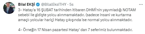 Türk Hava Yolları (THY) Genel Müdürü Bilal Ekşi, 16 Şubat'tan itibaren Devlet Hava Meydanları İşletmesinin (DHMİ) yayımladığı NOTAM nedeniyle Hatay'a gidiş seferlerinin yolcusuz yapıldığını, Hatay çıkışında ise normal yolcu alındığını bildirdi.