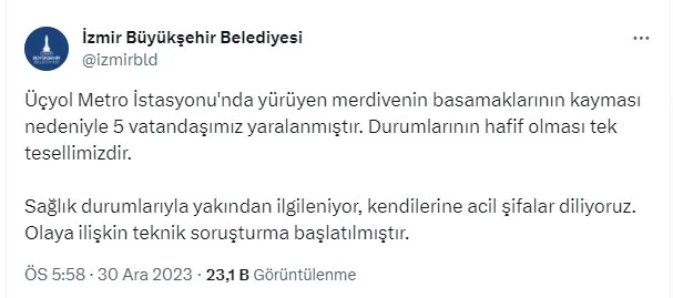 Üçyol Metro İstasyonu'ndan çıkışı sağlayan yürüyen merdiven, üzerinde yolcular bulunduğu sırada henüz belirlenemeyen nedenle bir anda ters yönde hareket etmeye başladı.