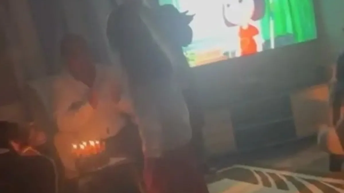 Annesi Yüksel Güran, babası Arif Güran ile ağabeyi Enes'in görüldüğü kutlamada Narin ışıkları söndürülmüş odaya koşarak gelip pastadaki mumları söndürüyor.