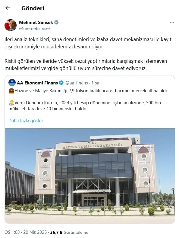 Hazine ve Maliye Bakanı Mehmet Şimşek sosyal medyadan yaptığı açıklamada "İleri analiz teknikleri, saha denetimleri ve izaha davet mekanizması ile kayıt dışı ekonomiyle mücadelemiz devam ediyor.