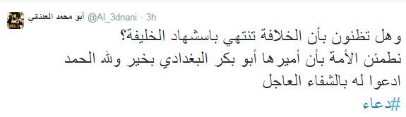 Irak Şam İslam Devleti (IŞİD) sözcülerinden Şeyh Ebu Muhammed Adnani'ye ait olduğu iddia edilen bir Twitter hesabından, IŞİD lideri Ebu Bekir Bağdadi'nin durumuyla ilgili açıklama yapıldı. Açıklamada, "Halife şehit olursa hilafet sona mı erer zannediyorsunuz? Ümmete Ebu Bekir Bağdadi'nin iyi olduğunu söylüyorum. O'na şifa için dua edin" denildi. Bu Twitter hesabının Adnani'ye kesin bir biçimde ait olup olmadığı şimdilik doğrulanamıyor.