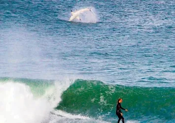 Avustralya'nın New South Wales eyaletinin Newcastle kenti sahilinde 3.5 metre büyüklüğünde bir beyaz köpekbalığı, bir sörfçünün 30 metre arkasında sudan zıplayarak çıktı.