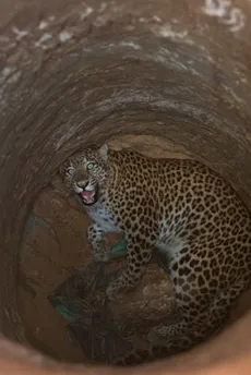Hindistan'da doğal yaşam alanları gittikçe daralan leoparlardan biri, Gauhati kenti yakınlarında bir su kuyusuna düştü.