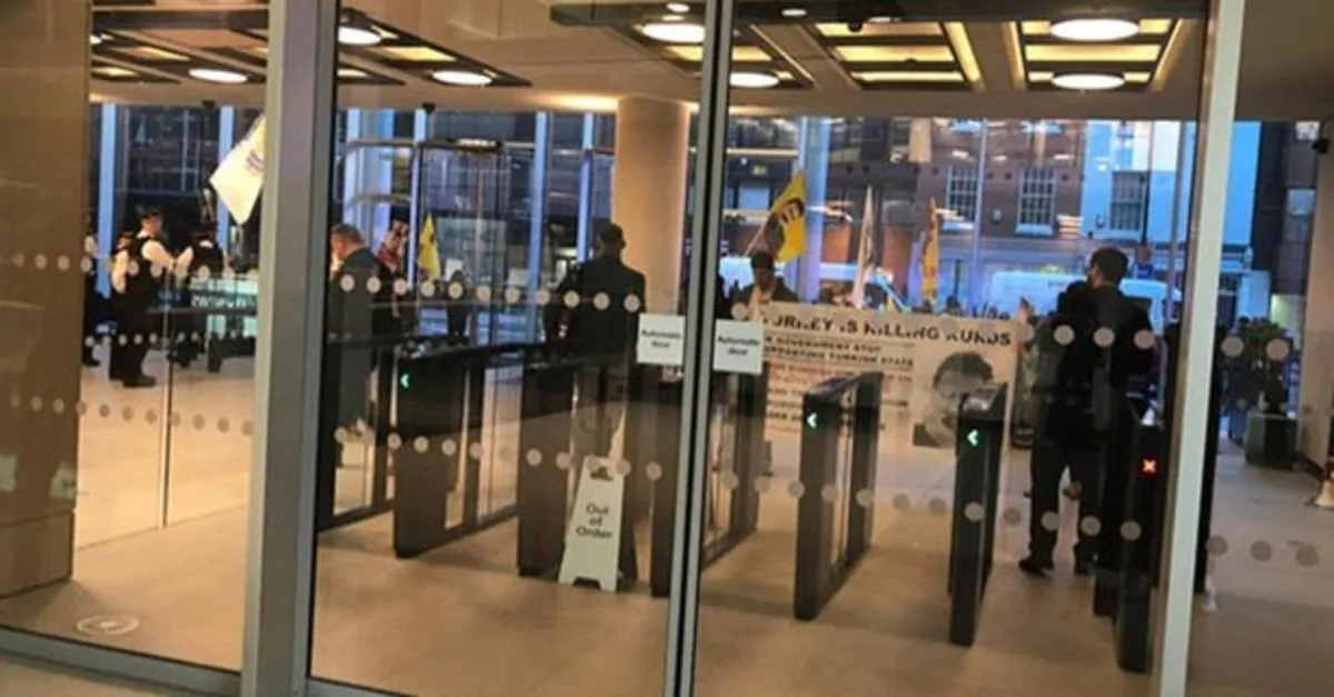 Güvenlik turnikelerini aşamayan terör örgütü yandaşları, daha sonra olay yerine gelen İngiliz polisi tarafından bina dışına çıkarıldı.