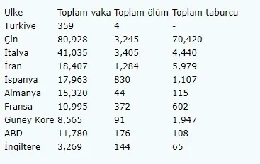 Ülkelere göre, saat 00.00 itibarıyla koronavirüs vaka, ölüm ve taburcu sayıları şöyle: