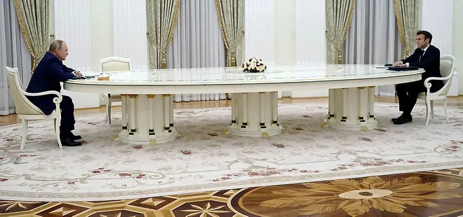 Rusya ve Ukrayna arasında yaşanan gerilim her geçen gün tırmanırken bugün usya Devlet Başkanı Vladimir Putin ile Fransa Cumhurbaşkanı Emmanuel Macron’un Moskova’daki Kremlin Sarayı'nda bir toplantı gerçekleştirdi. Toplantıda Putin'in Macron'u eli cebinde karşılaması ve iki liderin uzun masanın iki farklı noktasında oturması dikkat çekti.