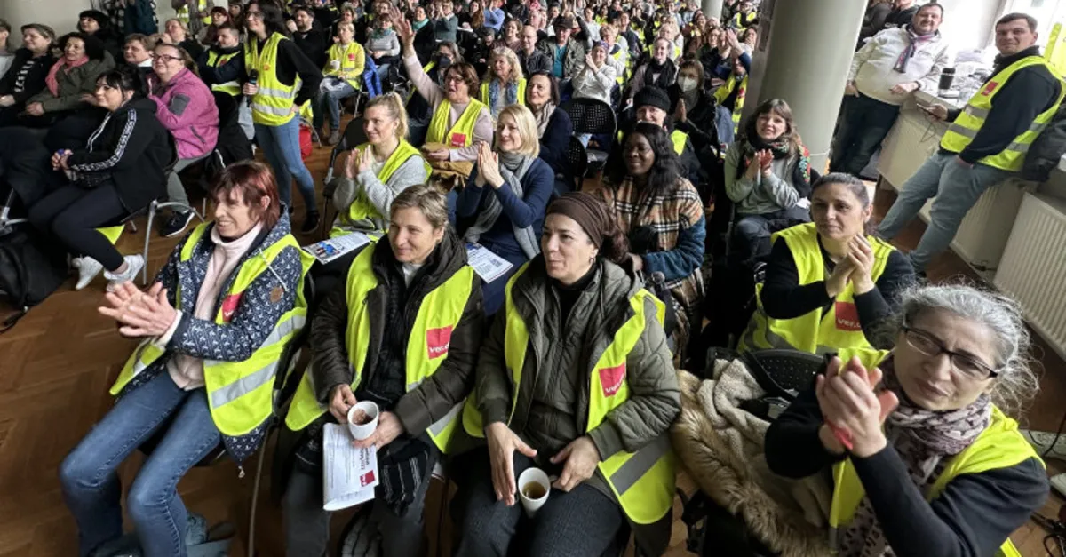 Almanya'nın başkenti Berlin'de Charite, Vivantes ve Yahudi hastanelerinde greve giden personel, CCG Salonu'nda toplandı. Burada ülkenin çeşitli kentlerinde greve çıkan hastanelerdeki kamu çalışanlarıyla çevrim içi bağlantı gerçekleştirildi ve karşılıklı destek mesajları verildi.