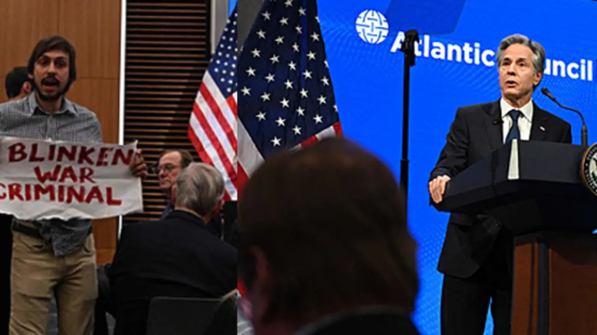 İşgalci İsrail'in katliamına verdiği destekle ön plana çıkan ABD yine tepkilerin odağına yerleşti. ABD Dışişleri Bakanı Antony Blinken, görevinin son dış politika konuşmasını yaparken şoke oldu. Konuşması kesilen Blinken Filistin yanlısı bir grup tarafından protesto edildi ve "soykırım bakanı" ve "sizi affetmeyeceğiz" sloganları atıldı.