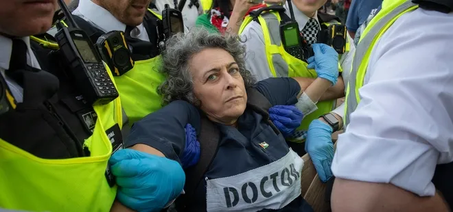 İngiltere'nin başkenti Londra'da, yasaklı örgüt ilan edilen 'Palestine Action' grubuna destek için düzenlenen protestoda 890 kişi gözaltına alındı. Parlamento Meydanı'nda dün bir araya gelen yüzlerce gösterici, hükümetin temmuz ayında aldığı yasak kararını protesto ederek grup lehine mesajlar taşıdı.