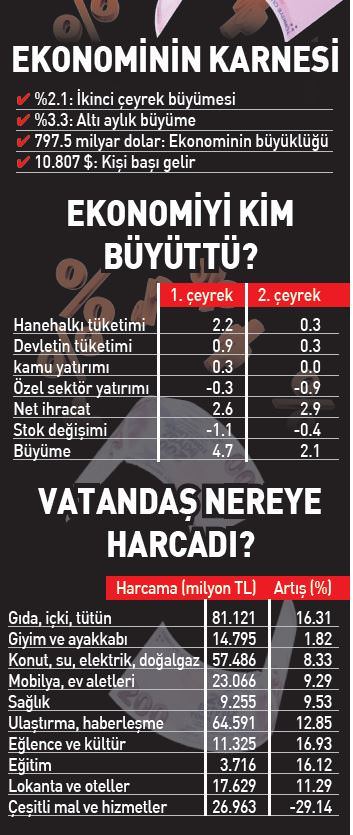 İkinci çeyrekte büyümeyi yurtiçi tüketim 0.3 puan, devletin nihai tüketim harcamaları 0.3 puan yukarı çekti. Özel yatırımlarının katkısı ise aşağı yönlü oldu. İhracat kaynaklı talebin bir kısmının karşılanması için stokların kullanılması, stok kaleminin de büyümeyi 0.4 puan aşağı çekmesine neden oldu. Devletin yatırım harcamaları ise katkı sağlamadı. Özel sektör yatırımlarındaki yıllık daralma yüzde 4'e ulaştı. Merkez Bankası'nın ocak sonunda olağanüstü toplanarak faizleri rekor seviyede yükseltmesi, özel sektör yatırımlarının durmasına neden olmuştu. 28 Ocak'taki olağanüstü Para Politikası Kurulu toplantısında, politika faizini yüzde 4.5'ten 10'a çeken Merkez Bankası, 8 aylık sürede sadece 1.75 puanlık faiz indirimi gerçekleştirdi. Merkez Bankası'nın bu politikası, ortalama yüzde 6.6 olan 3 aylık mevduat faizlerini yüzde 11.30'a kadar yükseltti. 'Paradan para kazanmayı' cazip hale getiren bu oranlar, özel sektörde yatırımların durmasına neden oldu.