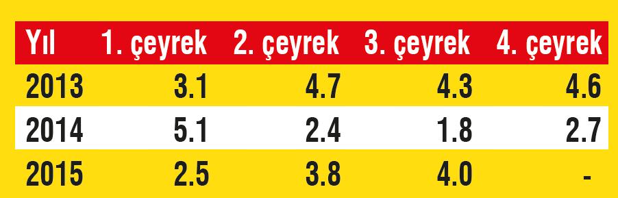 Türkiye ekonomisi bu yılın ilk çeyreğinde yüzde 2.5 ve 2'nci çeyreğinde yüzde 3.8 büyüme kaydetmişti. Geçen yılın tamamında ise büyüme yüzde 2.9 olarak gerçekleşmişti. Bu yılın 3'üncü çeyreğindeki yüzde 4'lük büyüme ile Türkiye, üst üste 24 çeyrek büyümüş oldu. Öte yandan Türkiye'nin yıllık cari açığı 38 milyar 109 milyon dolar ile son 5 yılın en düşük düzeyine geriledi. Cari işlemler açığı, Ekim'de geçen yılın aynı ayına göre 2 milyar 176 milyon dolar azalışla 133 milyon dolar oldu. 12 aylık cari işlemler açığı ise 40 milyar 286 milyon dolardan 38 milyar 109 milyon dolara gerileyerek, 2010 Ekim'den bu yana gördüğü en düşük düzeye indi.