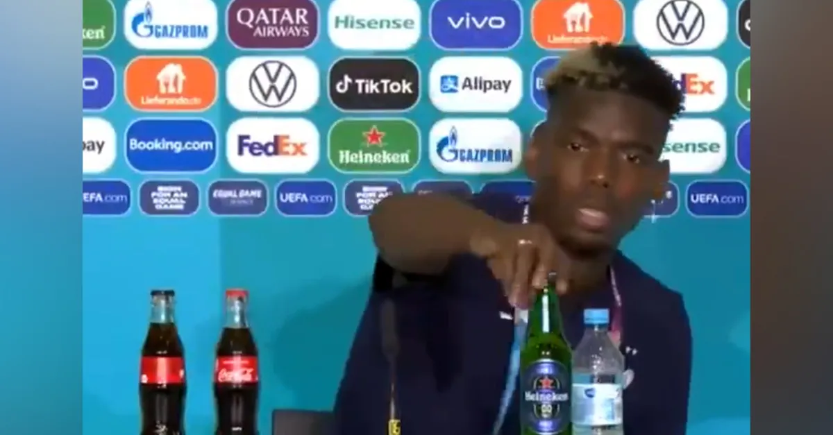 Pogba'nın yaptığı bir hareket ise tüm dikkatleri üzerine çekti. Müslüman olan yıldız futbolcu EURO 2020'nin sponsorlarından olan bira markası Heineken şişesini önünden kaldırdı.