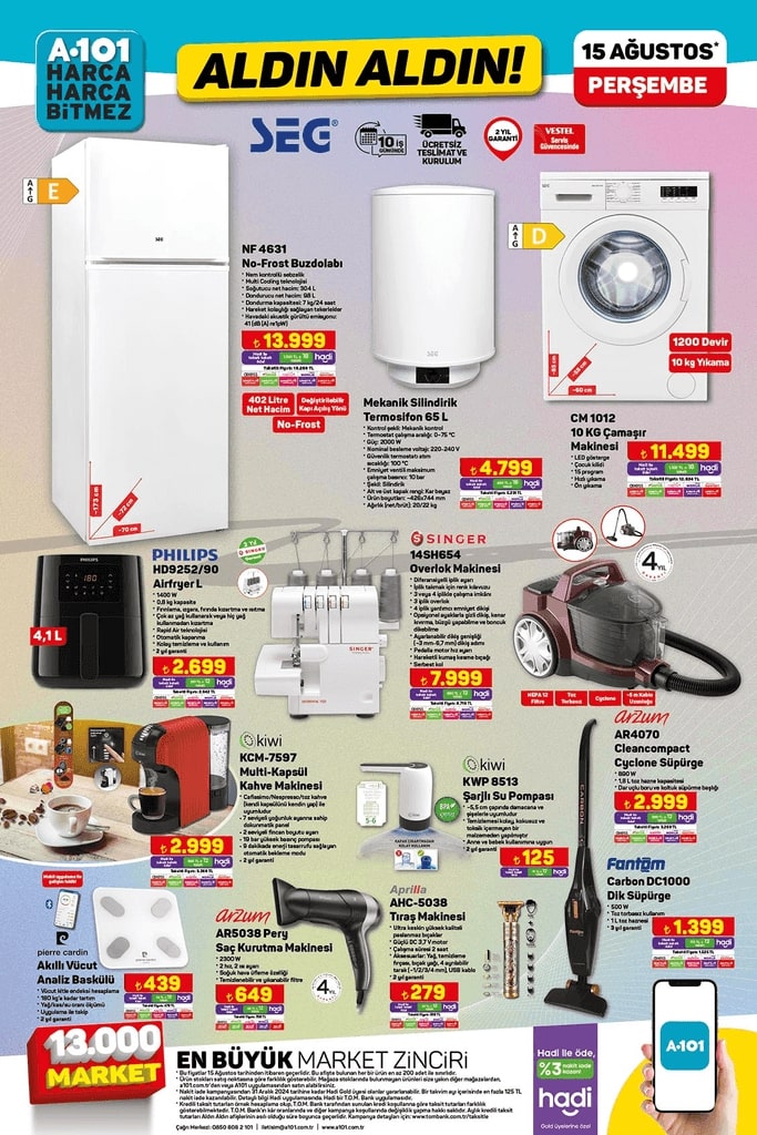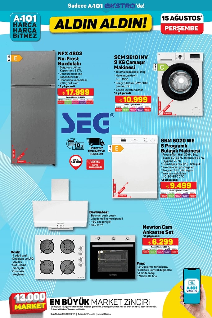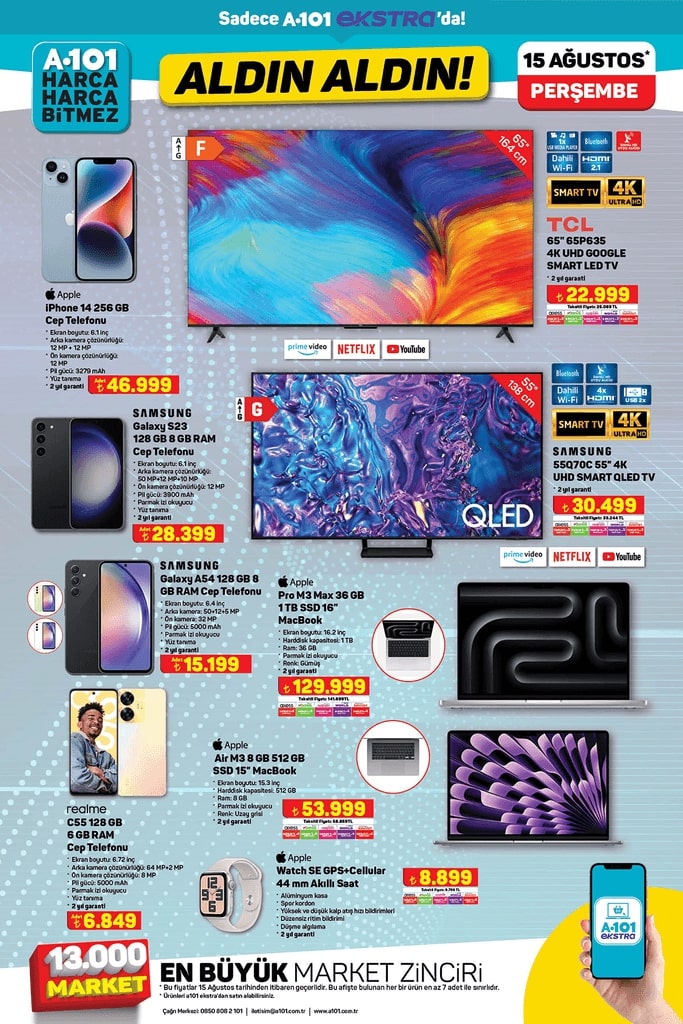 A101'in bu haftaki aktüel katalogu, dikkat çekici fırsatlar ve ürünlerle dolu. Haftanın yıldız ürünü olarak öne çıkan APEC APM5 Üç Tekerlekli Elektrikli Moped, katalogda yer alan ürünlerin arasında en çok ilgiyi çekenlerden biri oldu. Elektronik eşyaların ağırlıkta olduğu 15 Ağustos tarihli katalog, geniş bir ürün yelpazesine sahip. Her ihtiyaca uygun fırsatlarla dolu liste, A101 mağazalarında satışa sunulacak. Peki, bu hafta A101'de neler var? İşte haftanın fırsat ürünleri ve detaylar!