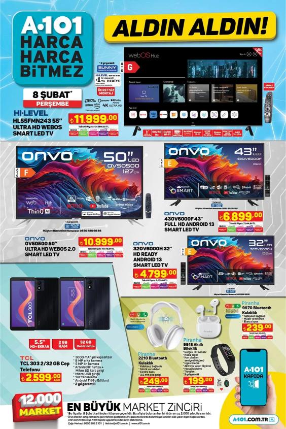 A101, 9 Şubat'tan itibaren geçerli olacak yeni aktüel ürünler kataloğunu duyurdu. Bu haftanın indirim kataloğunda dikkat çeken ürünler arasında HI-LEVEL 55" Ultra HD WEBOS Smart Led Tv 11.999 TL, Onvo 50" Ultra HD WEBOS 2.0 Smart Led Tv 10.999 TL, ve Onvo 43" Full HD Android 13 Smart Led Tv 6.899 TL gibi televizyonlar yer alıyor. Teknolojik ürünler arasında ise TCL 303 2/32 GB Cep Telefonu 2.599 TL, Piranha 2210 Bluetooth Kulaklık 249 TL, ve Piranha 9918 Akıllı Bileklik 199 TL gibi ürünler indirimde bulunacak. Beyaz eşya kategorisinde SEG CM 910S Silver Çamaşır Makinesi 10.999 TL, SEG CX 482 Inox No-Frost Buzdolabı 18.499 TL, ve SEG BM 6001X Bulaşık Makinesi 9.999 TL gibi ürünler öne çıkıyor. Ev gereçleri arasında ise Kiwi Koltuk ve Halı Yıkama Makinesi 4.899 TL, Homend 1261H Dustrider Şarjlı Dik Süpürge 3.499 TL ve Singer M1605 Dikiş Makinesi 3.999 TL gibi ürünler uygun fiyatlarla satışa sunulacak. İşte 15 Şubat 2024 tarihine kadar geçerli olacak A101 indirim kataloğu…