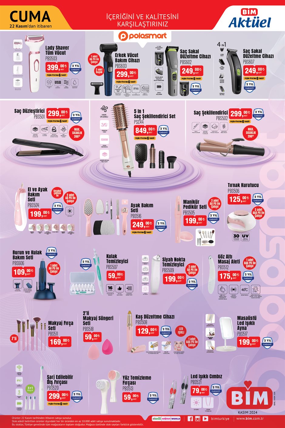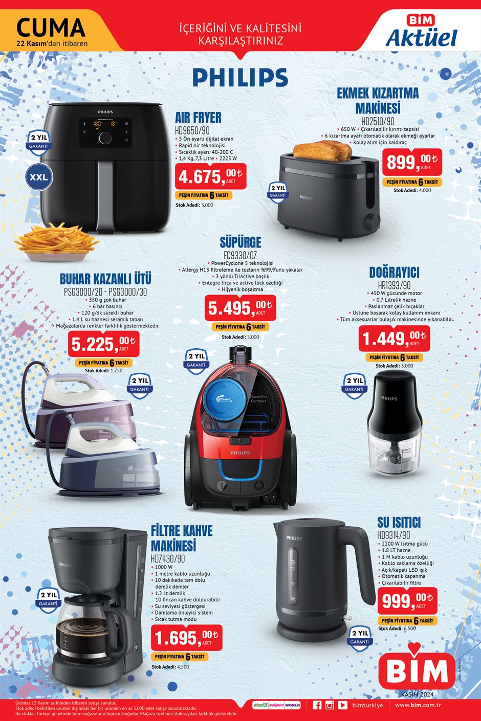 BİM, 19-22 Kasım tarihleri arasında geçerli olacak aktüel kataloğunu yayımladı. Salı ve Cuma günleri satışa sunulan ürünler arasında saç düzleştirici, ayak bakım seti, Air Fryer ve halı temizleme makinesi gibi birçok indirimli seçenek yer alıyor. İşte BİM'in bu hafta mağazalarındaki bazı fırsatlar…