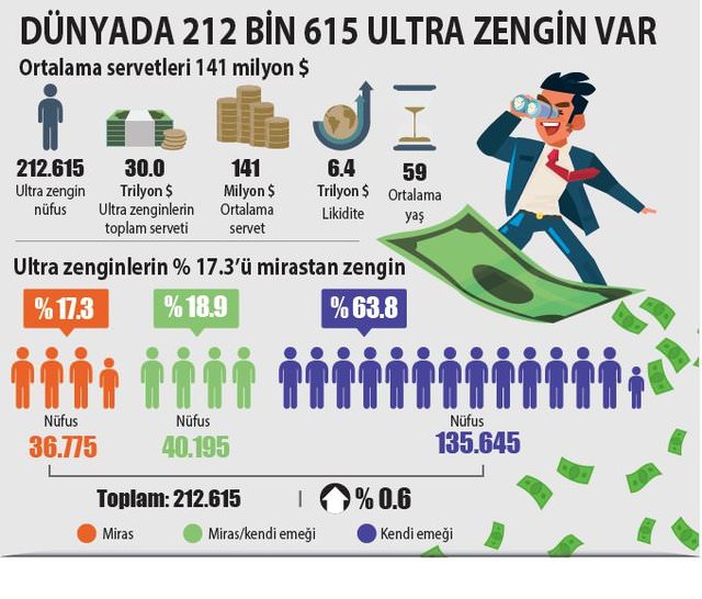 Kişisel serveti 30 milyon dolar ve üzerinde olan kişilerin baz alınarak yapıldığı hesaplamaya göre, dünyada toplam 212 bin 615 ultra zengin var.