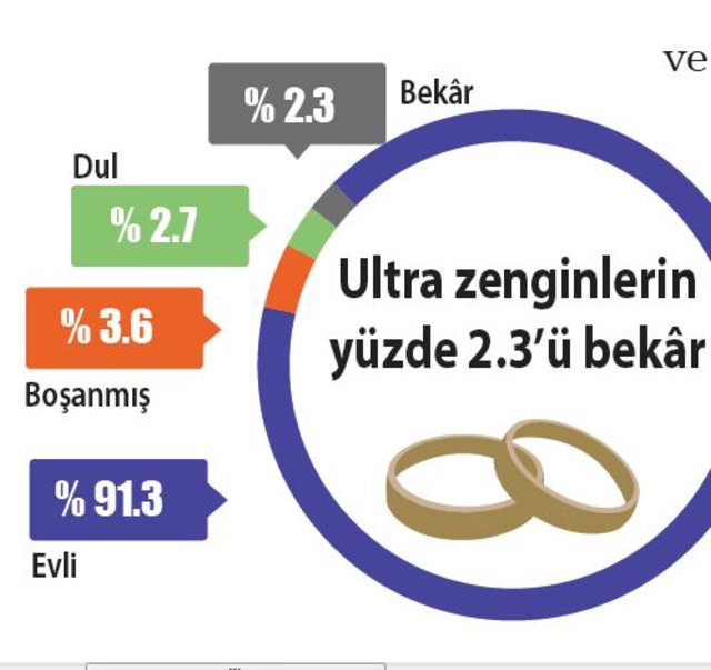 'Dünya Ultra Zengin Raporu'na göre dünyada kişisel serveti 30 milyon dolar ve üzerinde olan 212 bin 615 kişi var. Toplam servetleri 30 trilyon dolar. Yaş ortalamaları 59. 5 bini bekâr, 6 bini dul, 7 bini ise boşanmış.