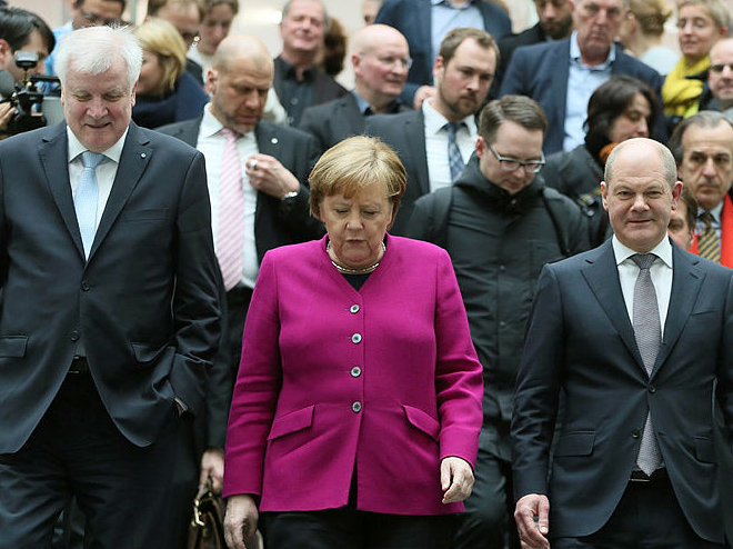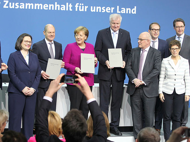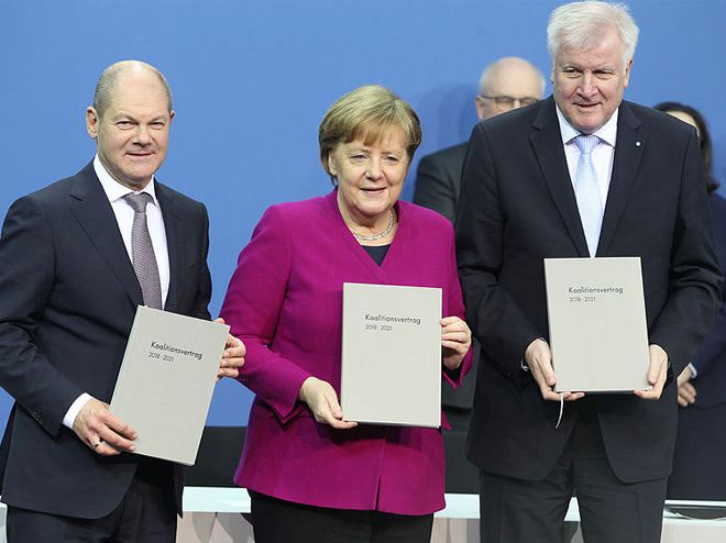 Almanya'da Hristiyan Demokrat Birlik Partisi (CDU), Hristiyan Sosyal Birlik Partisi (CSU) ve Sosyal Demokrat Parti (SPD) arasında uzlaşılan koalisyon protokolünün tanıtımı Başbakan ve CDU Genel Başkanı Angela Merkel, CSU Genel Başkanı Horst Seehofer ve SPD genel başkanlığına vekalet eden Olaf Scholz tarafından Federal Basın Merkezi'nde gerçekleştirildi.