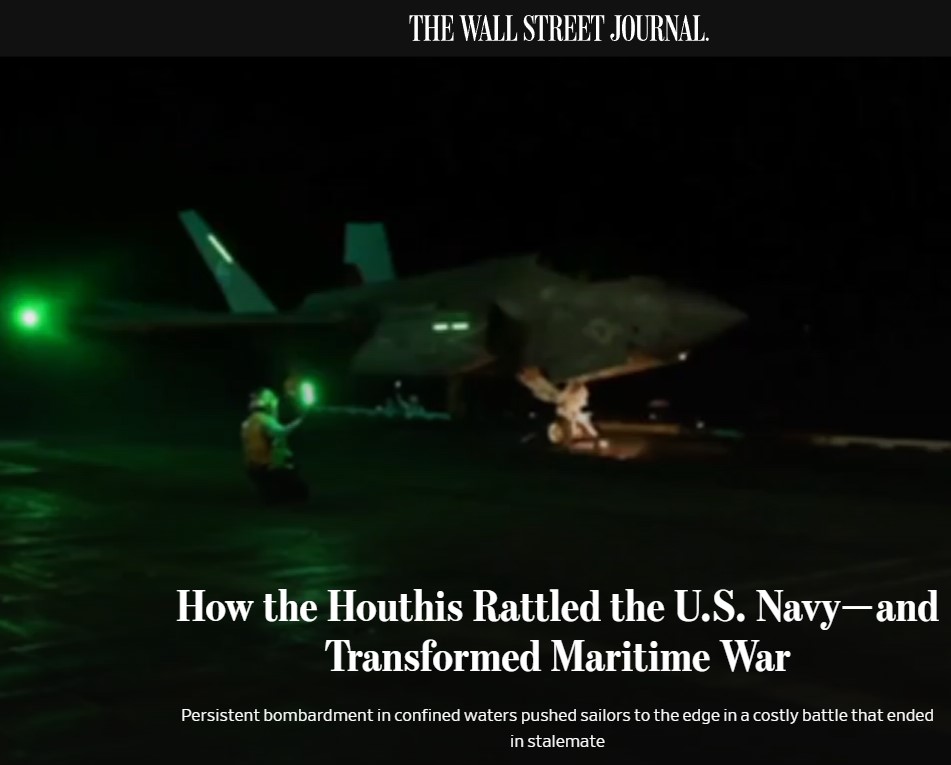 ABD merkezli Wall Street Journal, "Husiler ABD Donanmasını Nasıl Sarstı ve Deniz Savaşını Nasıl Dönüştürdü" başlığıyla yayınladığı analiz haberinde dünyanın güçlü donanmalarından ABD'nin Yemen'de silahlı bir örgüt olan Husiler'e nasıl yenildiğini analiz etti.