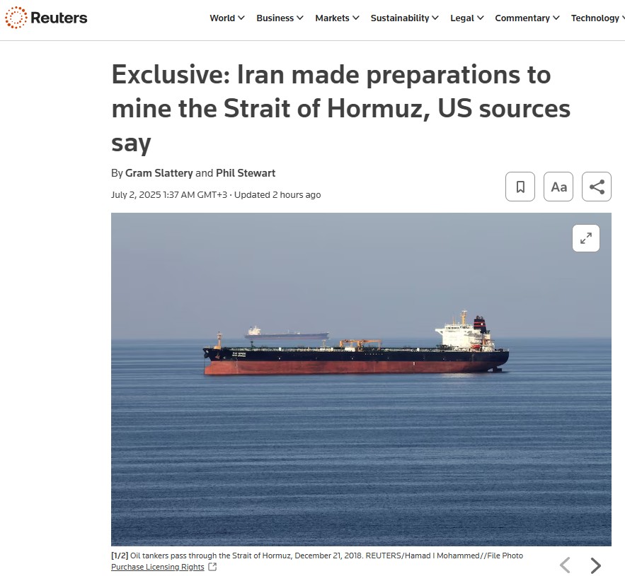 Haberde, ABD'nin 22 Haziran'da İran'ın üç önemli nükleer tesisine yönelik saldırısının hemen ardından, İran Meclisi'nin Hürmüz Boğazı'nı kapatma yönünde bağlayıcı olmayan bir önergeye destek verdiği de aktarıldı. Ancak kararın nihai olarak İran Yüksek Ulusal Güvenlik Konseyi tarafından verileceği belirtildi.