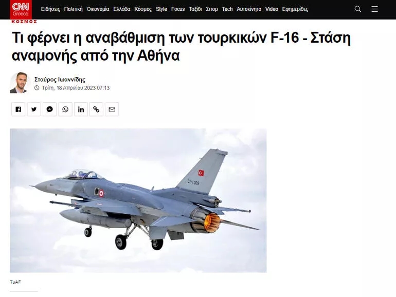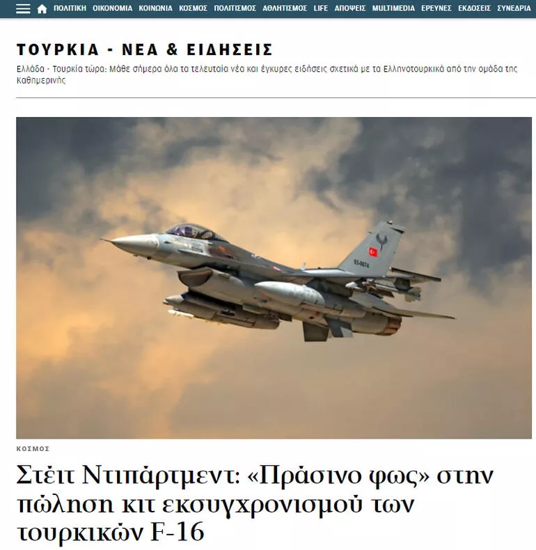 ABD Dışişleri, Türkiye'ye mevcut F-16 savaş uçaklarının iletişim sistemi olan Link-16 taktik veri bağlantı ağının modernizasyon kitlerinin satışına onay verdiğini Kongreye iletti. Link-16, taktik veri bağlantısı olarak da bilinen bir askeri telsiz ağı olup, NATO ve müttefik ülkelerce kullanılıyor. Bunun üzerine ABD'nin F-16 adımı Yunanistan'da manşet oldu. Türk F-16 savaş uçaklarının yazılımını yükseltecek paket için 'Yeşil ışık' ve 'F-16 ve F-35'ler için büyük pazarlık güçlü şekilde sürüyor' başlıkları atan Yunan medyası, Finlandiya ve İsveç'in NATO üyeliklerine vurgu yaptı.