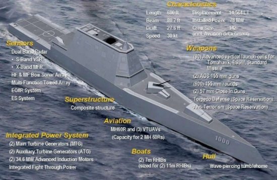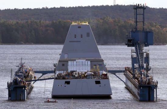 ABD donanmasındaki en büyük ve modern savaş gemisi, radardan gizlenme özelliğine sahip Zumwalt destroyeri ilk kez suya indirildi. 185 metre uzunluğundaki Zumwalt, 160 kilometre menzile sahip füze başlıkları taşıyacak.
