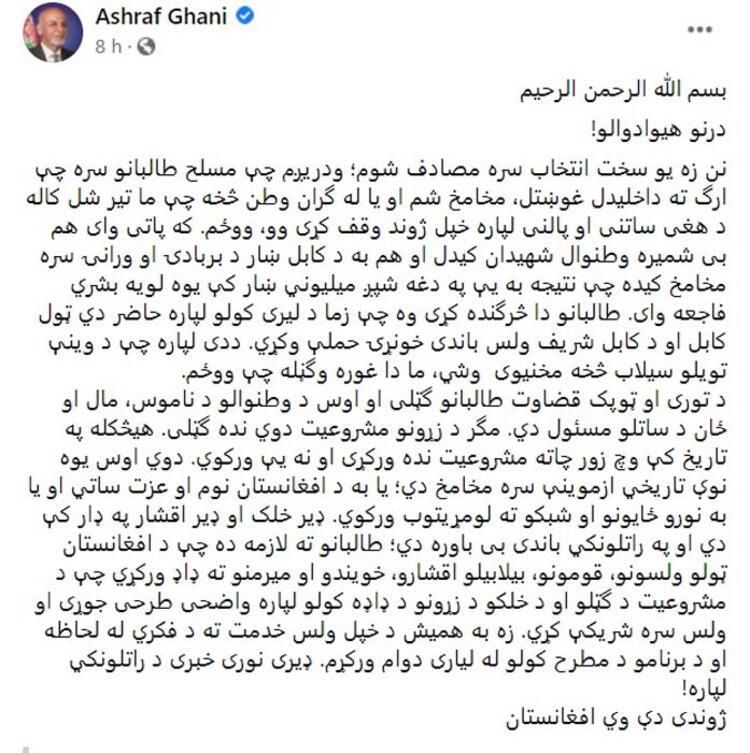 Cumhurbaşkanı Eşref Gani Pazar günü Afganistan'dan Özbekistan'a kaçtı, Taliban sözcülerinden biri Kabil'e bu kadar kolay ulaşmalarını beklemediklerini itiraf etti. Afganistan'da savaşın sona erdiğini açıklayan Taliban, ülke içinde ve dışında tüm taraflarla diyaloğa açık olduğunu belirtti.
