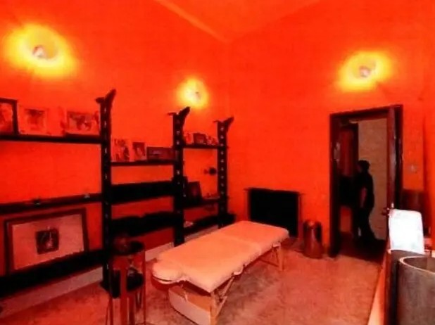 Fotoğraflarda kırmızı tonların hâkim olduğu, loş ışıklandırmalı bir masaj odası dikkat çekiyor. Paris savcıları, bu alanın ağır suçlamalara konu eylemler için kullanılmış olabileceğini değerlendiriyor.