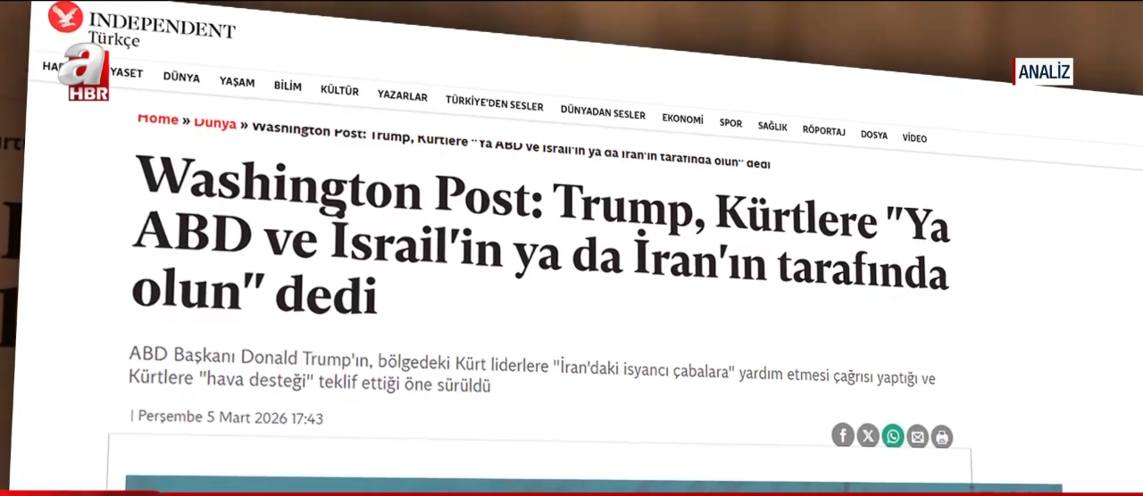 ABD yönetiminin terör örgütlerine verdiği askeri teçhizat ve hava desteği vaatleri, kirli ittifakı bir kez daha kanıtlıyor. Washington Post gazetesinin haberine dayandırılan analizlerde ABD'li yetkililerin Kürt gruplara destek sözü verdiği belirtilirken, Trump da "Kürtlerin İran'a kara saldırısı başlatmasını destekliyorum, bunu yapmak istemeleri harika bir şey" diyerek niyetini açıkça ortaya koydu. Bu noktada Başkan Erdoğan'ın yıllar önce yaptığı tarihi uyarı hatırlatılarak, "18 Mart 2016 tarihli konuşmasında İran'a yönelik 'Yılan besliyorsunuz, gün gelir o yılan sizi de sokar' uyarısı bugün karşılığını buluyor. O yılan şimdi kendilerini sokmaya başlıyor" değerlendirmesi yapıldı.