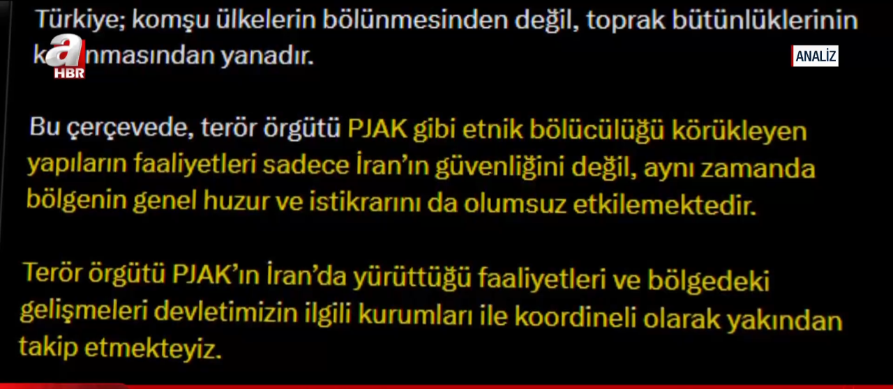 ABD ve İsrail'in İran'a yönelik sinsi planları bir bir gün yüzüne çıkıyor. Terör örgütü PKK'nın İran kolu PJAK üzerinden bölgeyi ateş çemberine almayı hedefleyen şer odakları, demografik oyunlarla İran'ı içeriden çökertmenin hesaplarını yapıyor. A Haber ekranlarında masaya yatırılan kirli senaryoda, terör koridoru ve iç savaş çığırtkanlığının perde arkası bütün çıplaklığıyla gözler önüne serildi.
