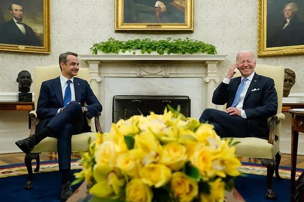 BİR DÖNÜM NOKTASI: WASHINGTON ZİYARETİ Yunan bağımsızlık savaşının iki yüzüncü yılı için ABD'nin başkenti Washington'da 17 Mayıs tarihinde ağırlanan Yunan Başbakan Miçotakis, Beyaz Saray'da ABD lideri Joe Biden'la görüştü. Yunan bayrağının renkleri mavi-beyaz kravat takan ABD lideri, Miçotakis'i 'Ben Joe Bidenopulos' cümlesiyle karşıladı.