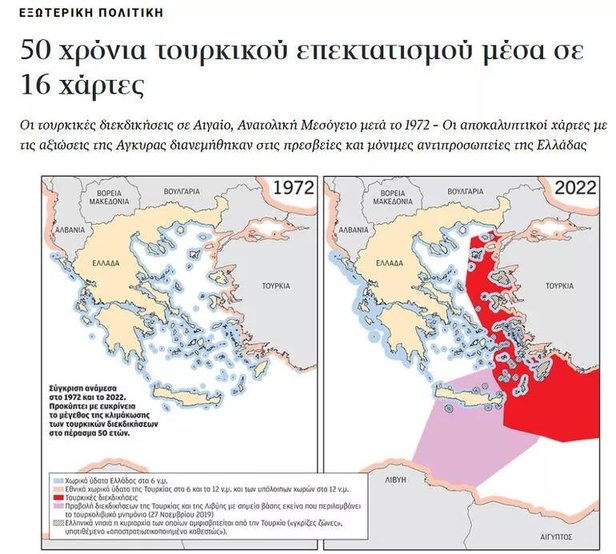 Haberde, Türkiye'nin 1972-2022 yılları arasındaki taleplerini yansıttığını öne sürülen haritalar arasında, "Mavi Vatan", "Türkiye Libya anlaşması", "Aidiyeti ihtilaflı coğrafi formasyonlar (Kardak vs)", "Adaların gayri askeri askeri satüsü" ve "TPAO'nun ruhsat verdiği bölgeler"in de bulunduğunu yazdı.