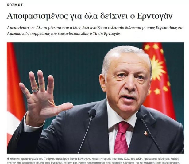 'ERDOĞAN HER ŞEY İÇİN KARARLI GÖRÜNÜYOR' Kathimerini gazetesinin İngilizce sayfasında yer alan 'Erdoğan her şey için kararlı görünüyor' başlıklı bir analizde, ABD ve Avrupalı müttefikleriyle yakın zamanda açtığı tüm cephelerde kararlı olan Tayyip Erdoğan'ın Çarşamba günü yeniden ortaya çıktığı belirtildi.