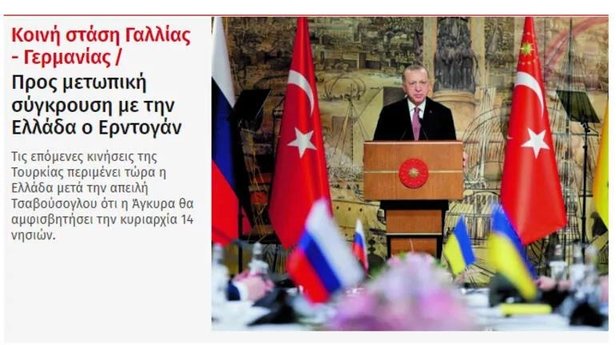 TA NEA: ATİNA BİR SONRAKİ ADIMI BEKLİYOR Ta Nea 'Fransa ve Almanya'dan ortak duruş: Erdoğan Yunanistan'la cepheden bir çatışmayla yüz yüze' manşetini attı, Türk Dışişleri Bakanı Mevlüt Çavuşoğlu'nun Ankara'nın 14 ada üstündeki Yunan egemenliğini sorgulayacağı yönündeki sözlerinin ardından Atina yönetiminin Türkiye'nin bir sonraki adımını beklediğini yazdı.