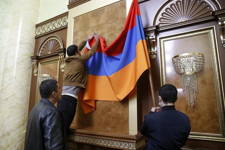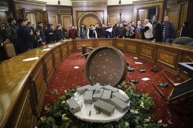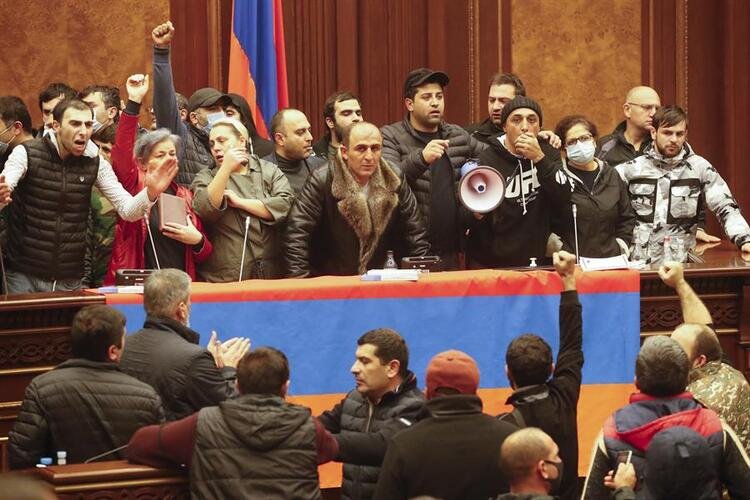 Azerbaycan ordusunun cephede diz çöktürdüğü Ermenistan, ağır bir mağlubiyet aldı. Yenilgiyi açıklayan Başbakan Paşinyan'a öfke seli sokakları savaş alanına döndürdü. Gözü dönmüş kalabalık Meclis binasını basarak Meclis Başkanı Ararat Mirzoyan'ı linç etmeye kalkıştı.