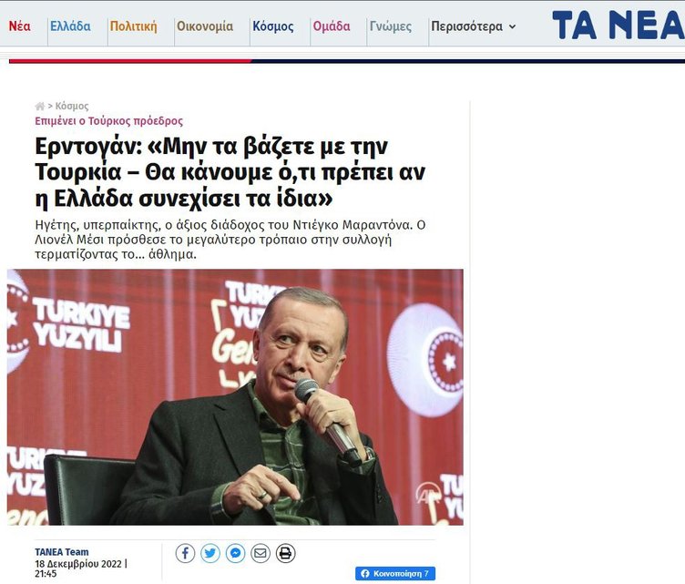 Yunan Kathimerini Gazetesi'ndeki konuya ilişkin haberde, Yunanistan'a yeni tehditlerde bulunulduğu iddia edildi. Başkan Erdoğan'ın yetkililere "Yunanistan saldırgan olmaya devam ederse ... Ne gerekiyorsa yapın" dediği vurgulandı.