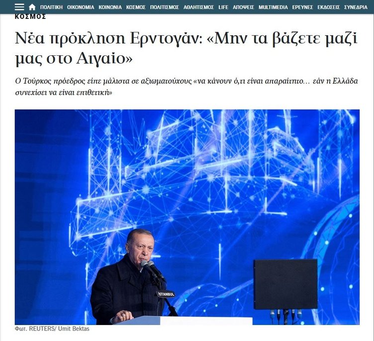 Ta Nea'da ise, Başkan Erdoğan'ın kışkırıtıcı açıklamalarda bulunduğu ileri sürüldü. Başkan Erdoğan'ın "Bizimle uğraşmayın. Sizinle Ege'de bir derdimiz yok. Ege'de yine çılgınlıklar yaptılar. Tabii biz de gereğini yaptık" diye konuştuğu belirtildi.