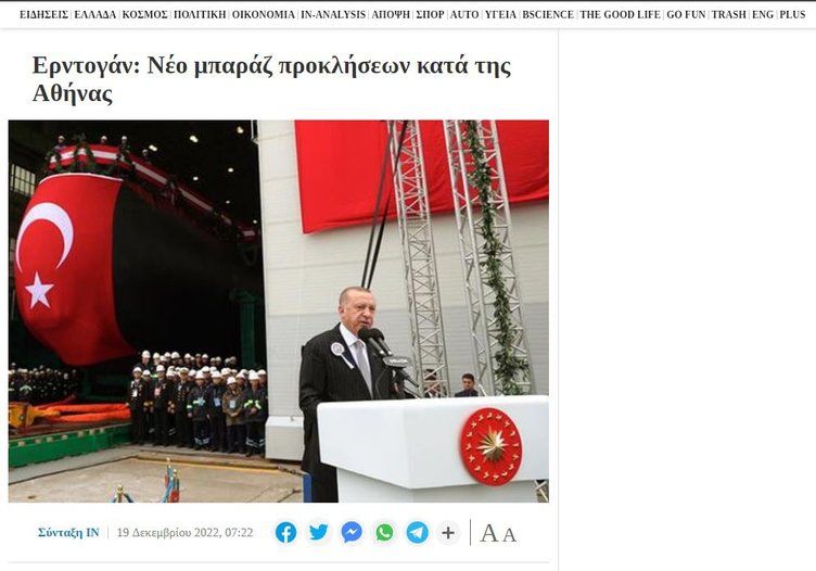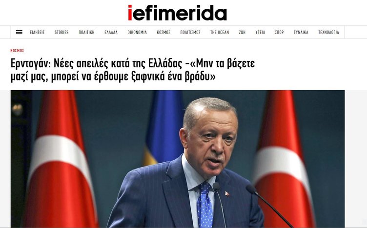 in.gr'de yer alan haberde ise, Başakan Erdoğan'ın on defa 'Bİr gece ansızın gelebiliriz' ifadesi kullandığını belirtti. "Ege'de yeni çılgınlıklar yaptılar, Tabii biz de gereğini yaptık" sözlerini gündemine taşıyan gazete, skandal ifadeler kullandı.