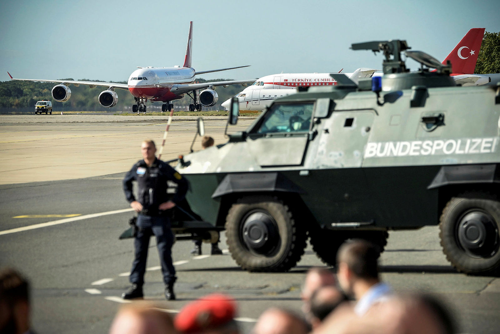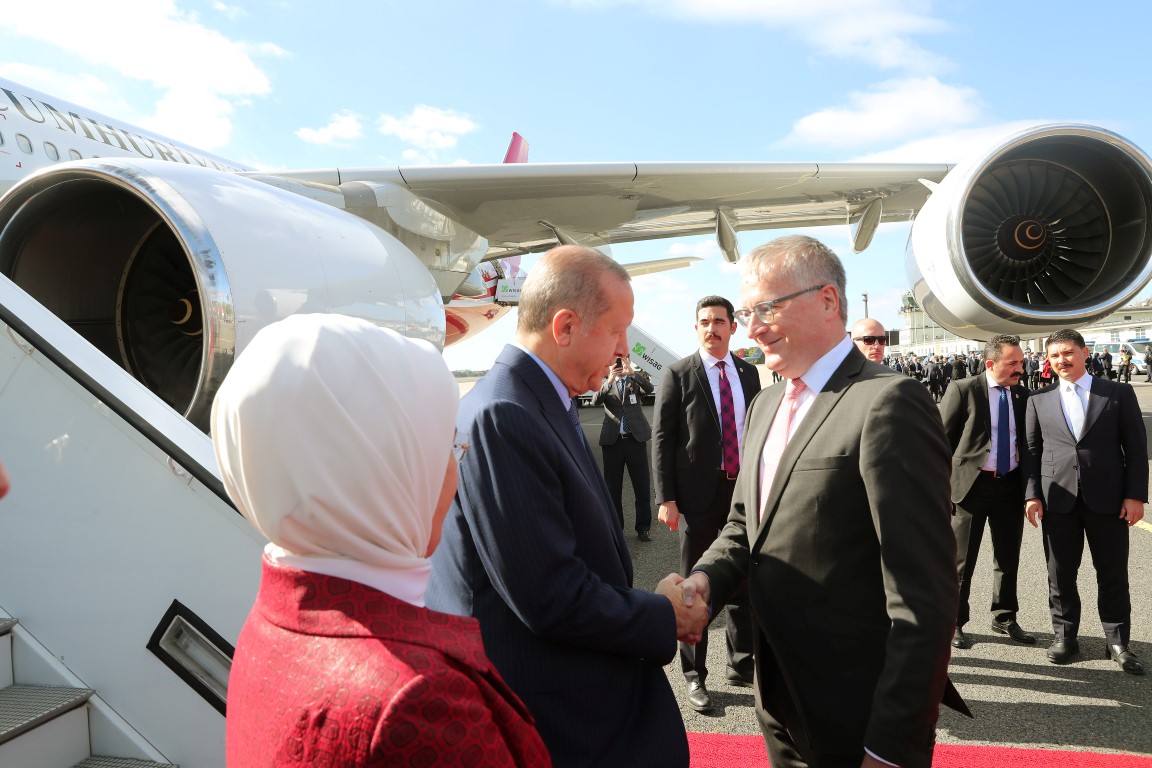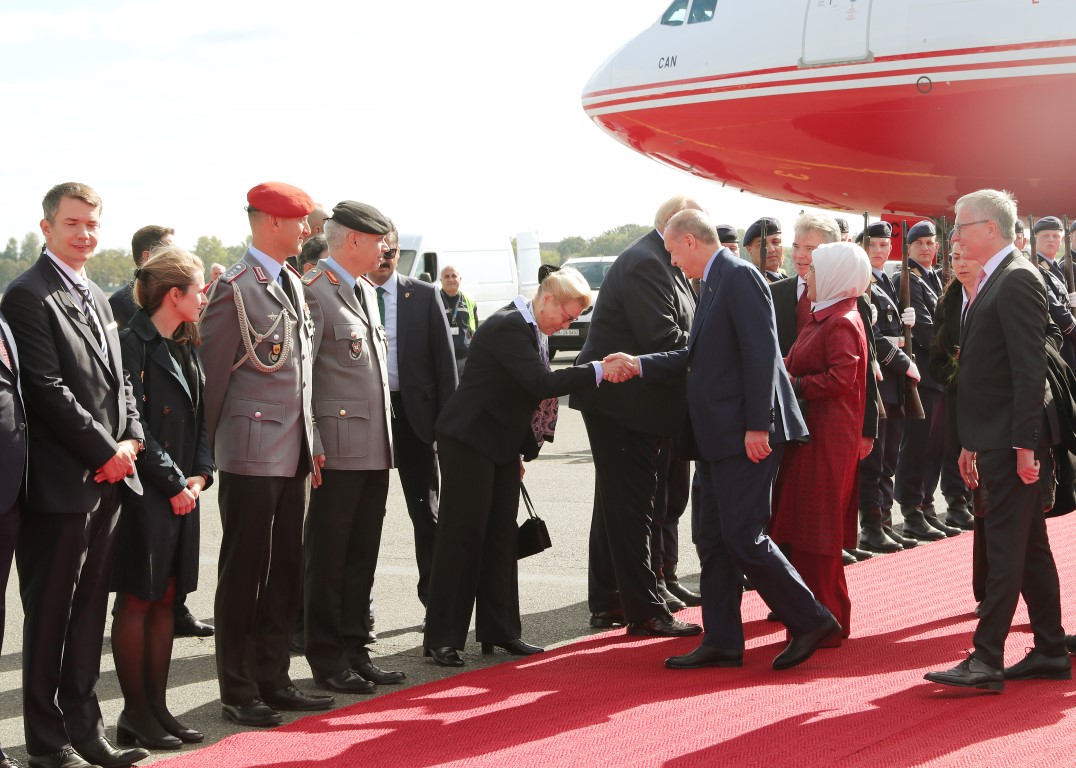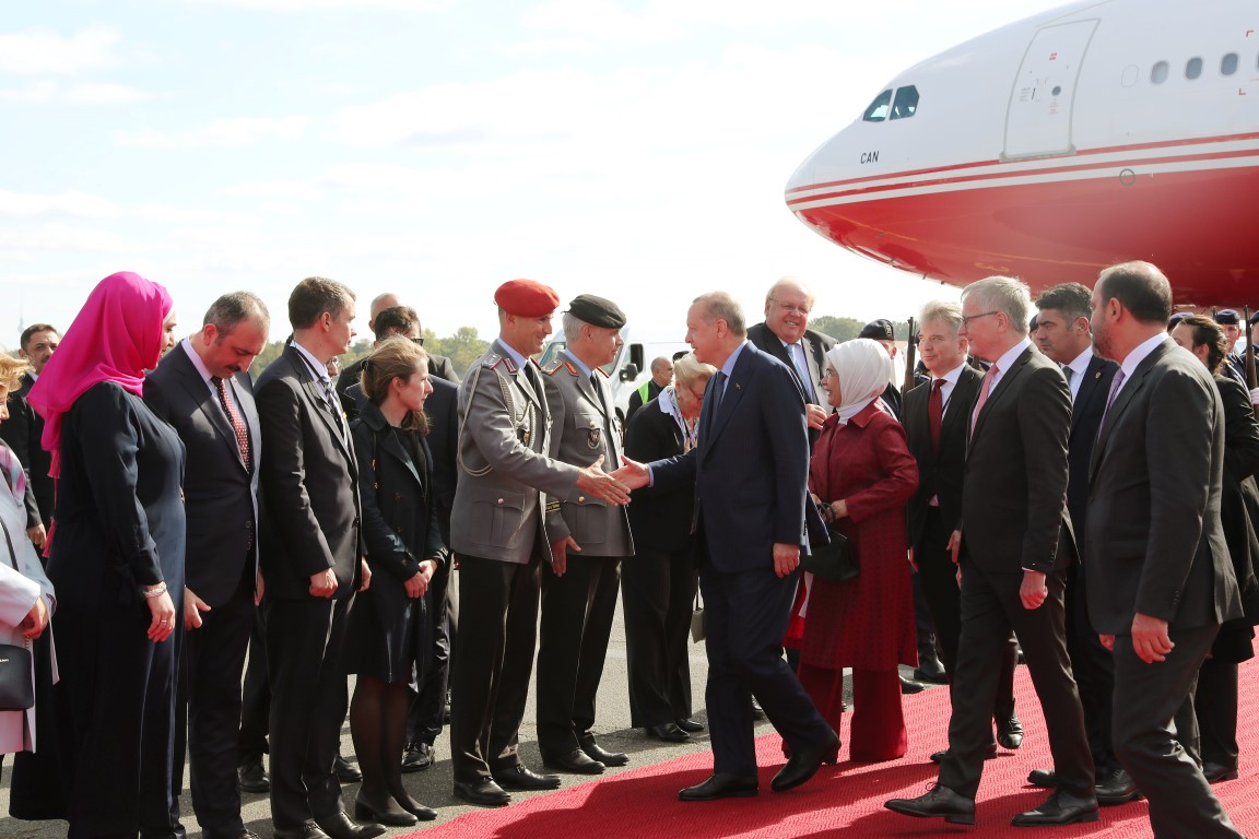 Cumhurbaşkanı Erdoğan ve eşi Emine Erdoğan'ı, Tegel Havalimanı'nın askeri bölümünde Türkiye'nin Berlin Büyükelçisi Ali Kemal Aydın ve eşi Berna Aydın, Adalet Bakanı Abdulhamid Gül ve eşi İlknur Gül, AK Parti Genel Başkan Yardımcısı Lütfi Elvan, AK Parti İstanbul Milletvekili Mustafa Yeneroğlu, AK Parti İstanbul Milletvekili Zafer Sırakaya, AK Parti İstanbul Milletvekili Akif Çağatay Kılıç, YTB Başkanı Abdullah Eren, UID Genel Başkanı Bülent Bilgi ve diğer yetkililer karşıladı.