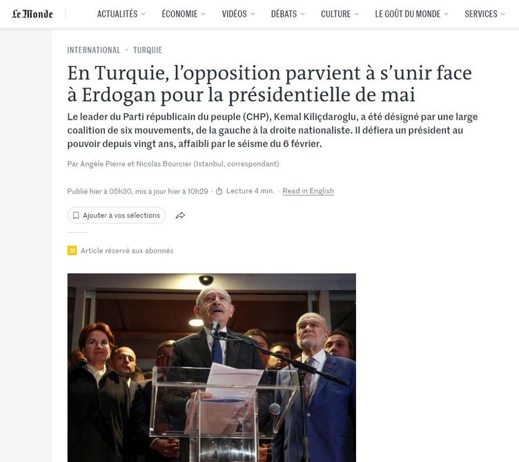 72 saat süren muhalefet krizinin ardından 6'lı koalsiyon adayını seçti. Kemal Kılıçdaroğlu'nun adaylığı dünya medyasında da gündem oldu. Fransız Le Monde "Yenilmez Erdoğan'a karşı" yarışan 6'lı masanın krizine dikkat çekti. 6'lı koalisyon için HDP'nin önemine dikkat çekilen haberlerde, Kılıçdaroğlu'nun Ekrem İmamoğlu'na tercih edildiği yazıldı. İsrail basını ise muhalefetin anlaşmazlığının Başkan Erdoğan'a yardımcı olduğunu vurguladı.