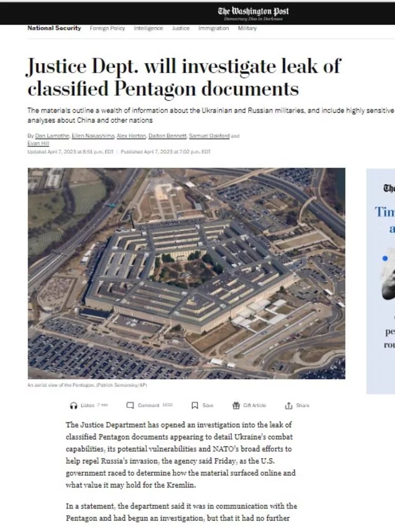 Yetkililer çok gizli belgeleri kimin sızdırdığını belirlemeye çalışırken, Adalet Bakanlığı konuya ilişkin soruşturma başlatıldığını duyurdu.