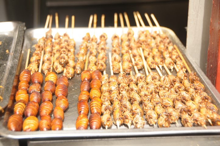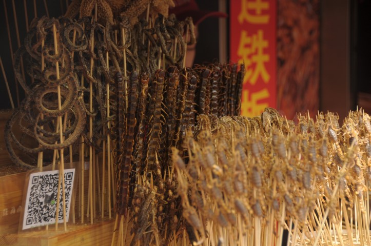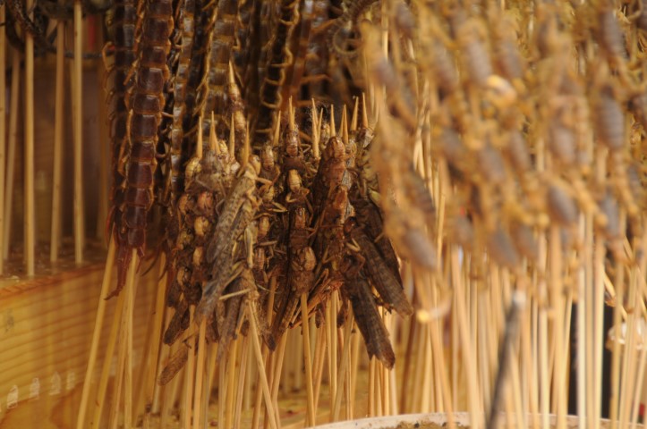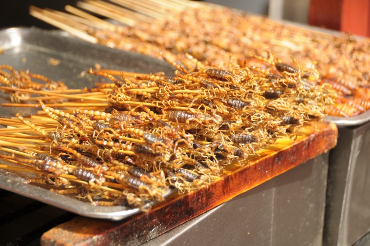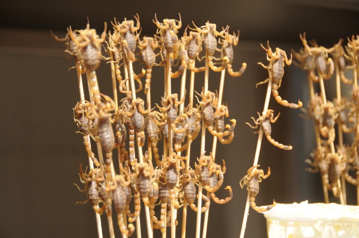 Başkent Pekin'in Vangfucing Caddesi'ndeki restoranlarda akrepten örümceğe, kırkayaktan hamam böceğine çeşitli haşarat farklı usullerle pişirilerek servis ediliyor.