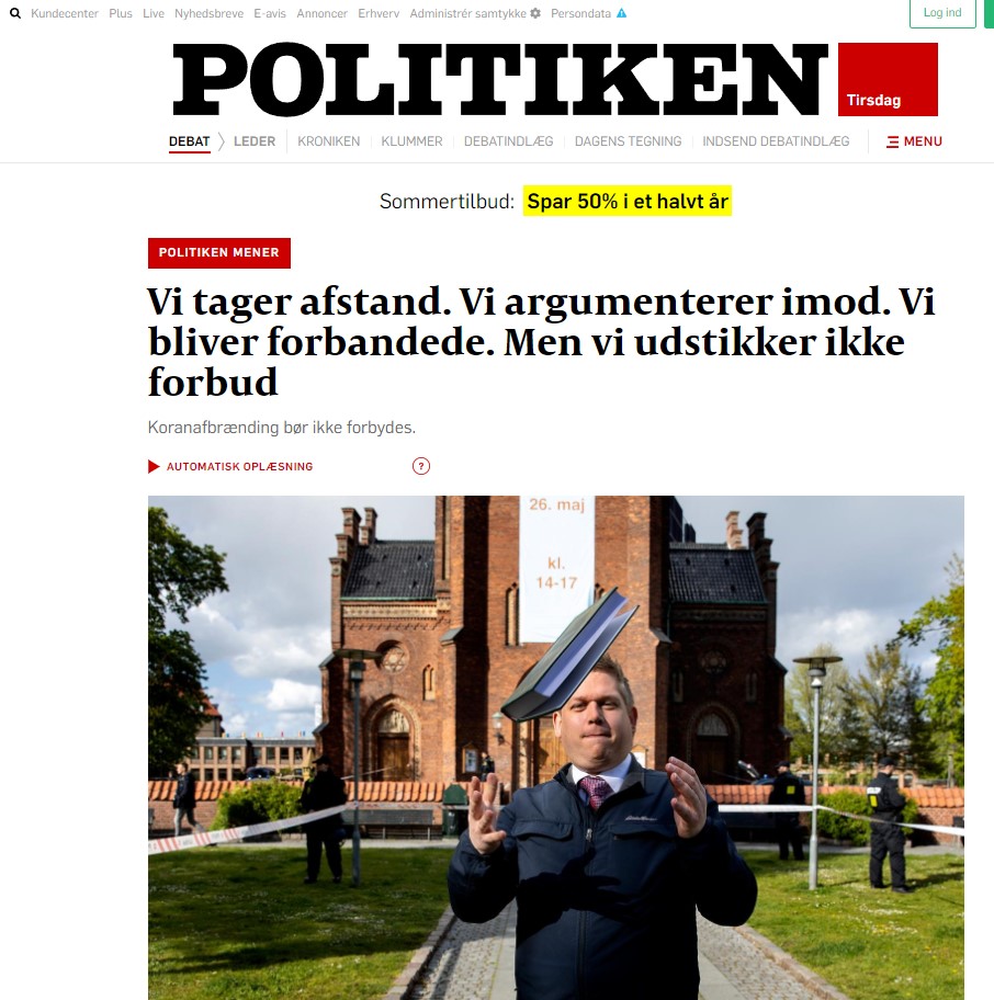 "Kendimize mesafe koyuyoruz, karşı çıkıyoruz lanetleneceğiz ama yasak koymuyoruz" başlığını atan sözde gazete Politiken "Kur'an yakma görüntülerinden ancak iğrenilebilir. Danimarka ve İsveç'te küçük bir grubun Müslümanların kutsal kitaplarını küle çevirerek dünyayı ateşe vermeyi görev olarak görmeleri hem çılgınca hem de utanç verici" cümlelerine yer verdi.